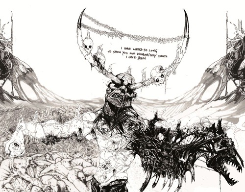 That’s a word that is overused, but in this case I think it applies. His work is disturbing and dark and grim, but also has a twist of pitch black humour running below it. Compromise did not come into it. I think it’s fair to say that at the time, this work divided the fans. I shall give you a clue as to which side of the fence I sit on by telling you that the page below is one of my favourite comic pages ever.