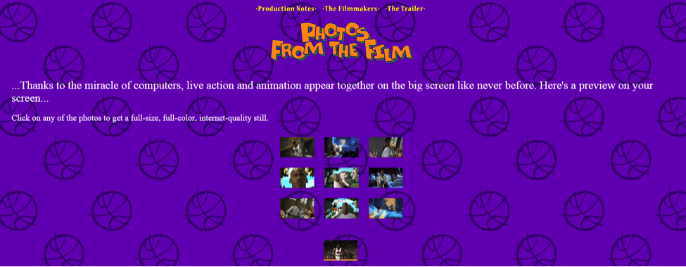 Featuring tiled images for backgrounds, visible tables galore, Quicktime movie clips, hundreds of image thumbnails, and images of the movie that are only 380 pixels for loading ease for poor dial-up modems, the Space Jam site is a monument to a bygone era.