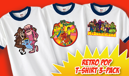 And speaking of nostalgia, our good friend Kurt from Kurt’s Shirts has assembled and specially priced a collection of three retro t-shirts sure to capture the attention of any geek who grew up in the Seventies. The set includes the General Mills Monster cereal characters, H.R. Pufnstuf and friends and the original denizens of McDonaldland including such forgotten characters as Captain Crook, the French Fry Gobblins, Uncle O’Grimacey and The Professor!