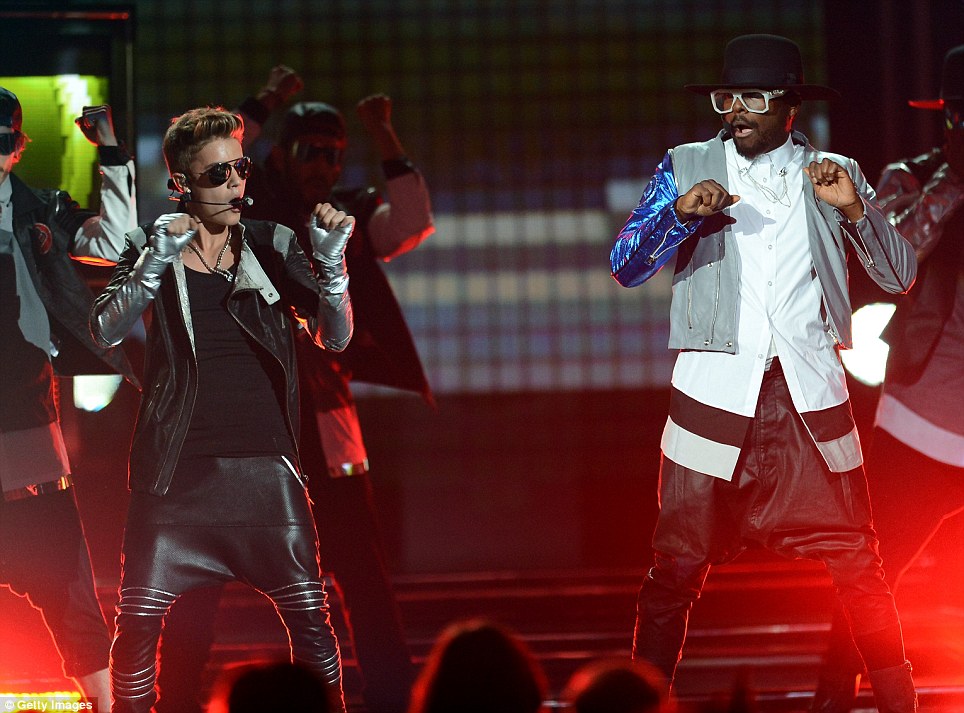 Oh joy, it’s Beiber and Will.I.Am together – BOTH IN THOSE STUPID PANTS. This is horrible, Justin has a live mic, and he’s just lamely “singing” into it under the taped track. And why is Will wearing a big, black Amish farmer hat – Jebediah I.Am. This is EDM, not Hip Hop. Ugh.