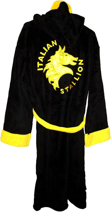 You’ll feel like entering the ring when you wear this colorful Rocky robe. The Rocky Fleece Robe is black with bright yellow trim, and offers a warm and soft feel. This hooded robe features the words “Italian Stallion” in yellow on the back surrounding a stallion’s head, and the word “Rocky” on the front. You won’t feel like the underdog when you relax in this comfortable Rocky robe!