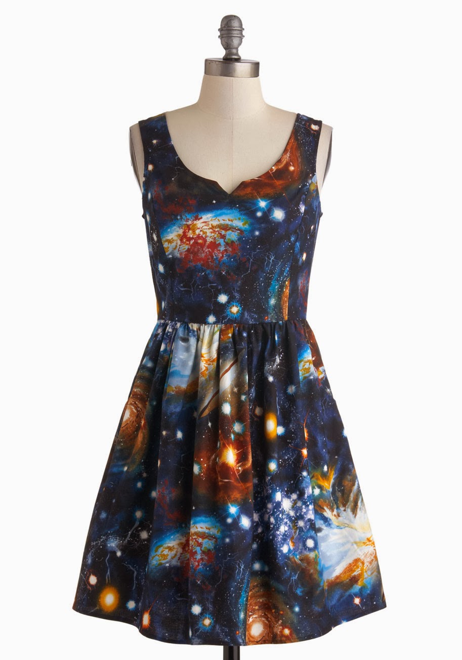 You’re presenting your Astronomy project at your university’s science fair today, and in honor of your most favorite academic subject, you arrive in this 100% cotton, intergalactic dress. Clad in the unique neckline, pocketed skirt, and classic cut of this look, you present your hard work with confidence. When this frock is paired with yellow pumps and jewelry that glistens like the night sky, you feel as proud of your style as you are of your astronomical display!
