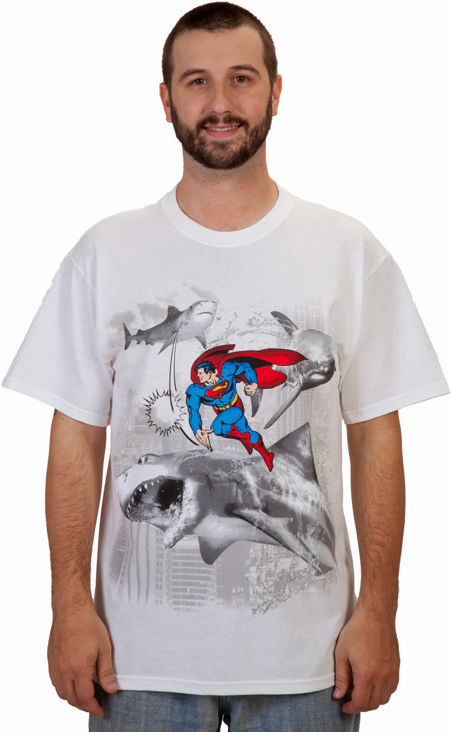 This Superman shirt shows what might happen if the Man Of Steel were caught in the middle of a Sharknado. Here, Superman is shown fighting off some ferocious airborne sharks. Between Krypton, Kansas and Metropolis, Superman probably hadn’t seen many sharks. Still, he is shown putting up a good fight. This shirt is perfect for fans of Superman and Sharknado.