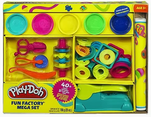 With more than 40 pieces and five cans of Play-Doh your kids can mold, shape, and cut nearly any creation they can imagine! This gigantic set includes scissors, plastic knife, pizza cutter, roller, Fun Factory extruder with two rails, play mat, 22 cutters, and five 5-ounce cans of Play-Doh modeling compound.