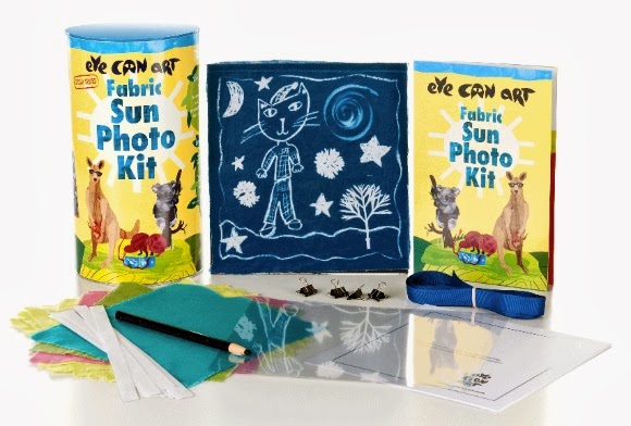 The Fabric Sun Photo Kit comes with light-sensitive fabric, plastic sheets for making patterns, a pencil for drawing on the plastic, and instructions. Children take a plastic sheet and draw on it with the kit’s pencil. Next, children can put the plastic over the fabric and lay any objects – such as leaves, feathers or paper shapes – on top of it in concert with the drawing. Children then place another sheet of plastic on top and clip all three pieces together (with the clips provided). Next, children lay all the layers out in the sun from 5 to 15 minutes, depending on weather and season. This will result in the shapes being transferred from the plastic to the fabric, batik-style.