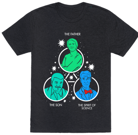 The trinity of science, brought to you by: Carl Sagan, Neil DeGrasse Tyson, and Bill Nye. All listen to these three as they bring scientific knowledge to the general public. Their words help the common folk to understand why the world is the way it is without resorting to some book that apparently contains all the answers. So let your love of science run free with this Science Trinity shirt