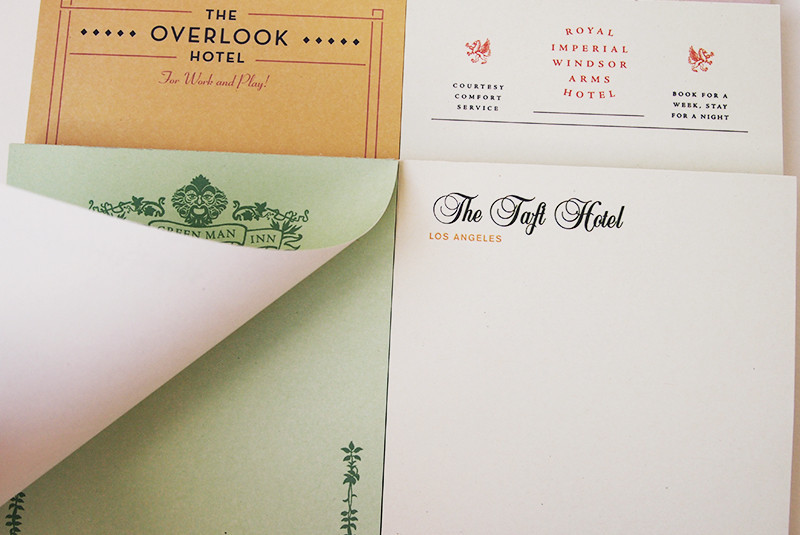 Six notepads for fictional hotels. Just the sort of thing you find by the telephone in most lodgings, from the grandest establishment to a lowly fleapit. You get Bertram’s Hotel (At Bertram’s Hotel, Agatha Christie) The Great Northern Hotel (Twin Peaks) The Overlook Hotel (The Shining) Royal Imperial Windsor Arms Hotel (National Lampoon’s European Vacation) The Green Man Inn (The Wicker Man) and The Taft Hotel (The Graduate) These hotels are out of reach to all, no matter their wealth. They exist only in the imaginations of their creators, and now in these paper pads.