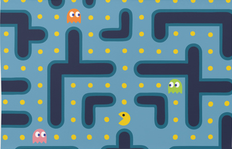 I really want to be cool when it comes to my home, filling it with Mid-Century modern furnishings and knick-knacks that could come straight from the hippest part of the interblogs. Unfortunately, I have an inner child who hasn’t moved past the “I WANT MY HOUSE TO LOOK LIKE THE MOVIE ‘THE TOY'” so my abode looks like a couple of twelve year olds managed to talk a grown-up into giving them a house and have thus filled it with stuff from Toys R Us. And this Pac-Man area rug fits that particular aesthetic like a glove (and goes with the rest of our Pac-Man stuff that we have).