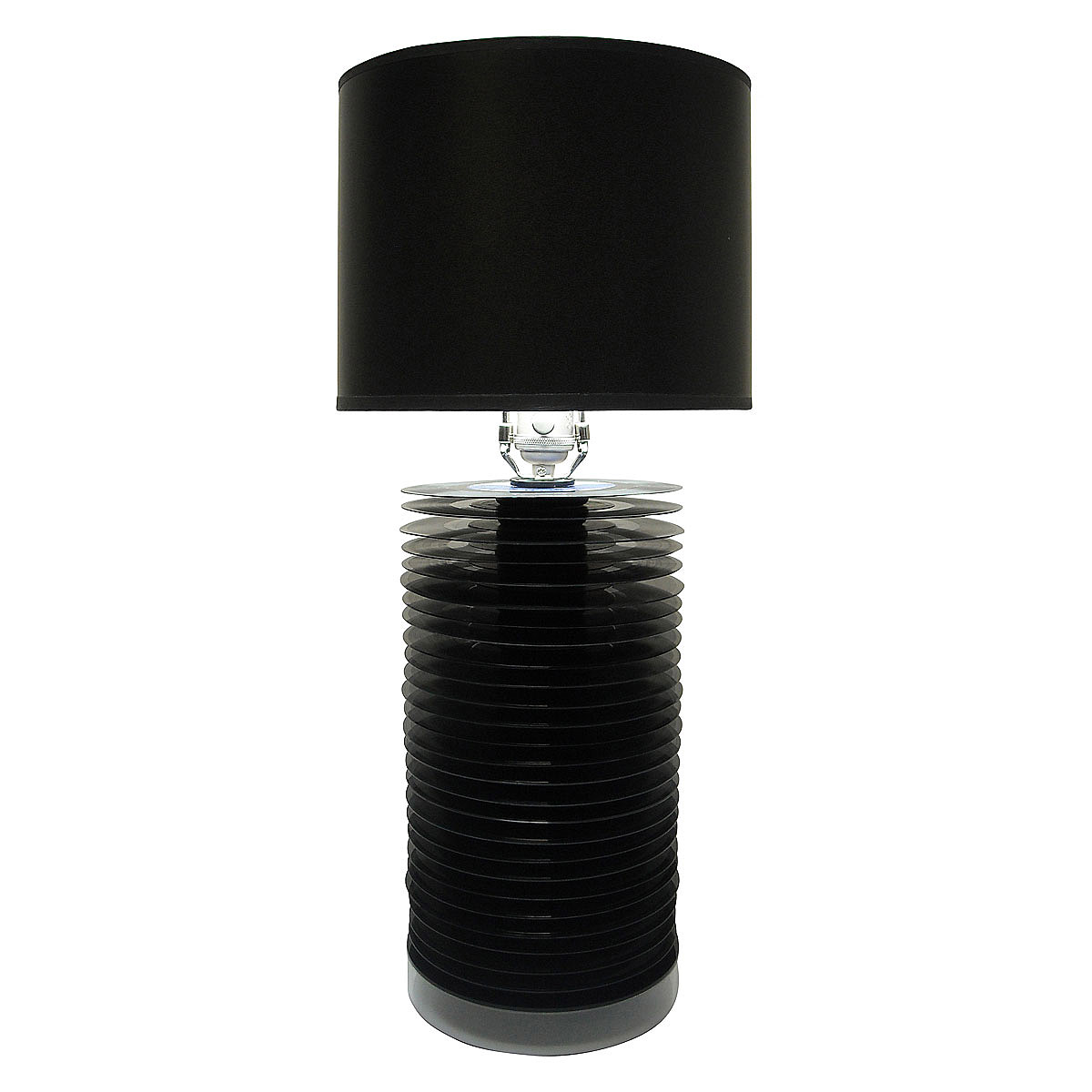 This illuminating, contemporary desk lamp shines a light on both the future and the past. The ultra-modern design plays with contrasting texture, color and material, all within the constraints of a vertical cylinder. But while the style is forward-looking, it carries an element of nostalgia at its very core: the horizontal lines of the base are created from a stack of vintage, 45 records. Rather than focusing on the musical aspect of the records, the layered black vinyl becomes a dynamic, geometric element, with their appearance seeming to shift depending on your perspective. With an 8 foot cord, you’ll be able to position the lamp on a desk, in a favorite reading corner, or someplace where it can become a visual focal point.