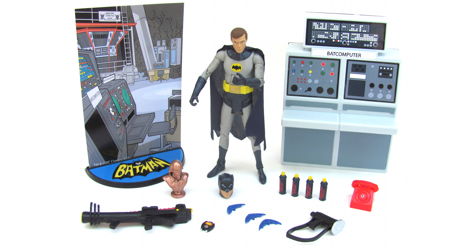Product Highlights: Interchangeable Bruce Wayne and Batman heads Bookcase with a Shakespeare bust and red-hot Batman phone Opening the bookcase reveals switches and a concealed compartment Secret storage area behind the bookcase for hiding the Caped Crusader’s retro weapons, including Batman spray and other iconic weapons Batcomputer for stopping super villains Plenty of retro-styled accessories from the classic TV show 6″ figure is posable.