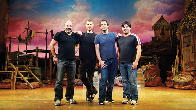 | From left, Casey Nicholaw, the co-director and choreographer; Matt Stone, Trey Parker and co-writer of book and music, Robert Lopez |