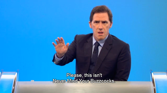 The game is divided into several categories such as “If this is the answer, what is the question” in which a short answer (such as 300) is provided and panelists must come up with the correct question to the answer–after several rounds of joke questions (such as “How many miles did The Proclaimers actually walk before saying ‘sod it’.”). “Scenes we’d like to see” proposes subjects (e.g., Things you wouldn’t hear on a news program) and the players take turns going to a center microphone with their funny answers. There is also a standup challenge in which a few of the panelists go to a center stage and are assigned topics to which they must form a spontaneous standup routine for.