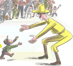 We see George with his mother, brothers and sisters, but in his very next book George is taken from Africa by the Man with the Yellow Hat with no depicted psychological turmoil, per se. George’s abduction is played more as an adoption, and George is more than willing to be with his new friend.