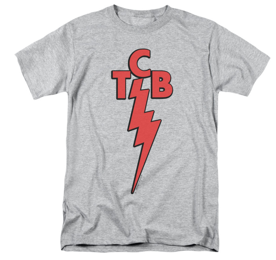 The King of Rock n’ Roll had an expression, which became both a mantra and way of living his life that is depicted in this shirt, which means “Taking Care of Business.” The lightning bolt was an homage to Elvis’ favorite superhero, Captain Marvel Jr.