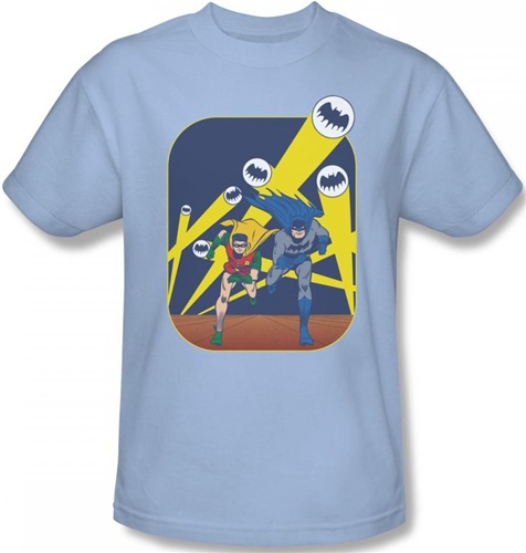 Utilizing the cover art of 1950’s Detective Comics #164, this t-shirt features the art of George Roussos of the Dynamic Duo dodging bat signals illuminating the night sky.