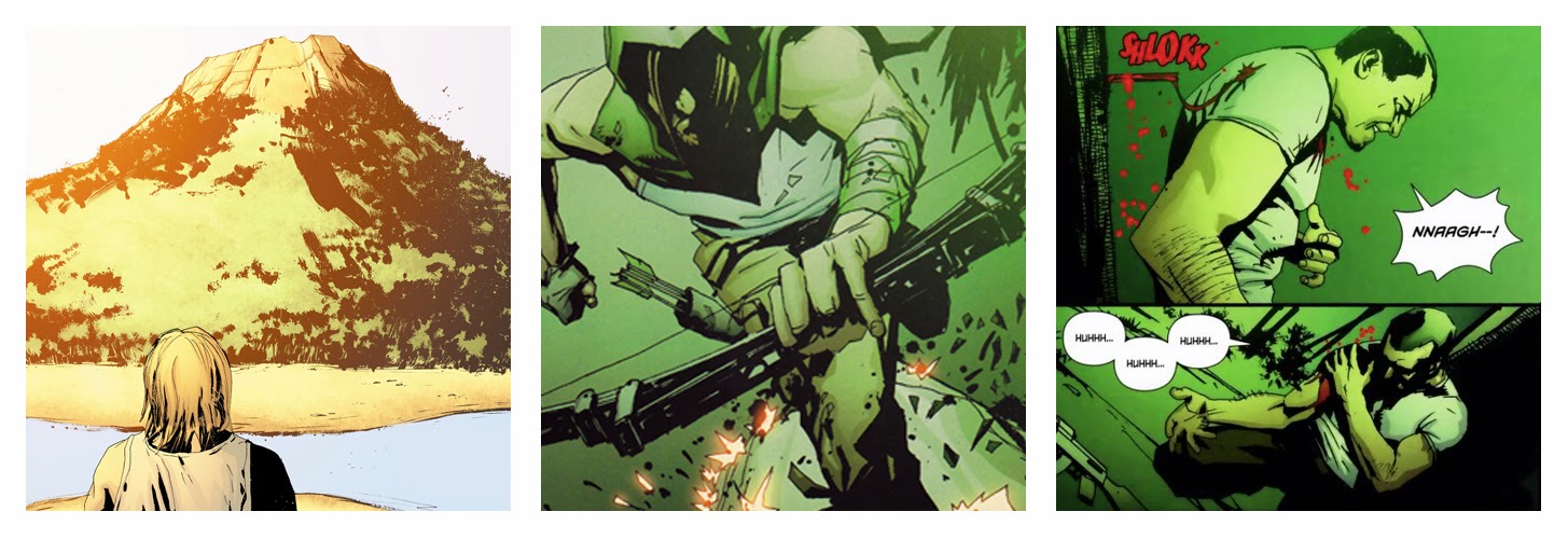Taking cues from Miller and Mazzucchelli’s work, like simple and gritty artwork (more shadow-based than detailed linework) and a running inner dialogue of Oliver Queen as he’s stuck Tom Hanks-style on an island surviving for before running into anyone.
