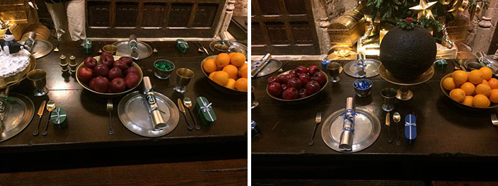 Each table’s cutlery, napkins and other decorations are all, of course, themed according to each house’s sigil. The windows have falling snowflakes projected onto them from somewhere beyond the set’s walls, giant wreaths are hung over the fireplaces and huge decorated pine trees stand behind every table, including with a glittery witch whirling around the highest bough of each one.