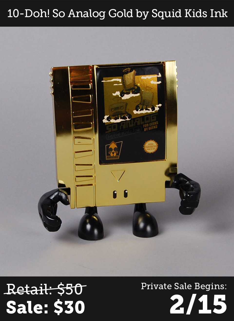 Squid Kids Ink is known for their unique art collectibles, including vinyl toys, prints and shirts.  One of their coolest figurines is a testament to retro gaming and Denitah will offer their limited So Analog Gold figure starting February 15th!  The 7″ tall figure is made out of ABS with Hands and feet made of PVC. This onetime convention exclusive figure is offered at 40% off it’s $50 retail cost.  Retro gamers and toy collectors can add this to their collection for only $30 through Deniath.