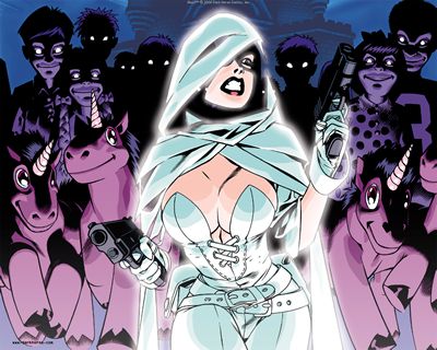 On a whim, I resolved to track down the complete run of Dark Horse’s Ghost series. The first volume is mostly collected in a convenient pair of color omnibus trades. I’m not entirely sure why I did this. Of course I was aware of the character during her heyday, but never actually read the book. I loved her look though–aside from her obvious charms, Ghost reminded me of a female version of the shadow. Something about a veiled, gunslinging femme fatale just spoke to pulp enthusiast in me. Sometimes, I just get these impulses towards doing things.