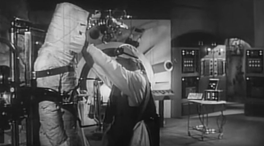 Befitting a film sent in the near future (although at different points of the production the working title of the film was Frankenstein 1960 and Frankenstein 2000), the lab had to have been updated. There’s no more stray sparks lighting dingy stone walls. Instead, we have banks of early computers and an atomic pile used to build the monster. One can appreciate the effort made to give the mad scientist an up-to-date lab to work with. It’s not perfect, thanks to a jerky automatic rollout gurney and a disposal unit when operable that uses the sound effects of a toilet flushing (presumably because their original choice of a meat grinder was considered in bad taste…), but ignoring those elements it’s actually a decent set piece.