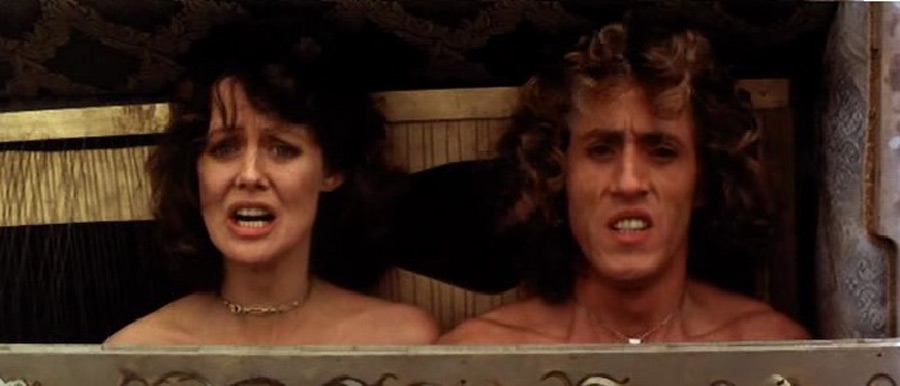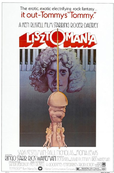 We open cold in a bedchamber from the mid-19th century, as reimagined by the set department at Shepperton Studios. We find the composer Franz Liszt (Roger Daltrey) in bed with his music student and lover, Marie d’Agoult (Fiona Lewis), kissing and suckling her breasts in time with a metronome. Every now and then, Marie reaches over to make the metronome go faster, and Franz tries to keep up.
