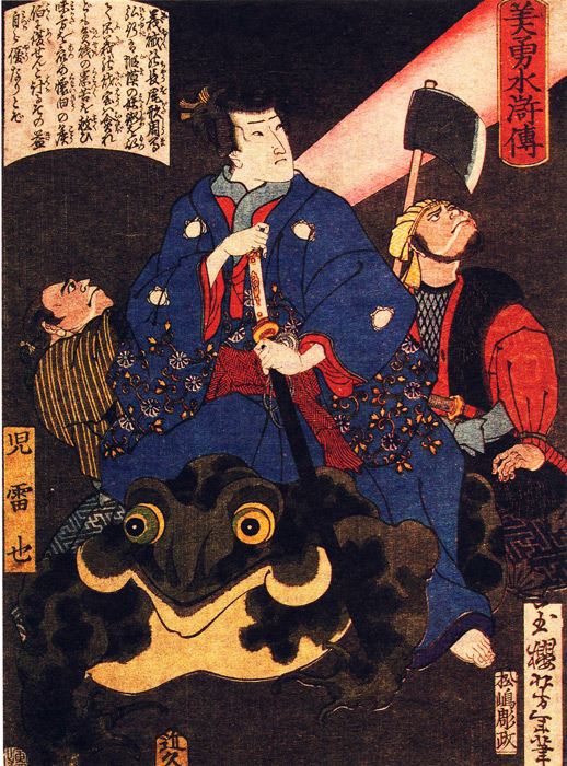 Jaraiya astride a giant toad, as depicted in 1866 by Tsukioka Yoshitoshi