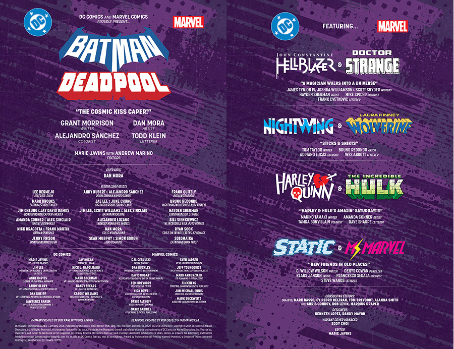 And be sure not to miss these incredible extra stories: Scott Snyder, James Tynion IV, and Joshua Williamson team up with Hayden Sherman for a magical Constantine/Doctor Strange tale! Tom Taylor and Bruno Redondo bring you an epic Nightwing/Dick Grayson and Laura Kinney/Wolverine story! Mariko Tamaki and Amanda Conner smash Harley Quinn and the Hulk together! G. Willow Wilson and Denys Cowan tell an electrifying Static and Ms. Marvel yarn!