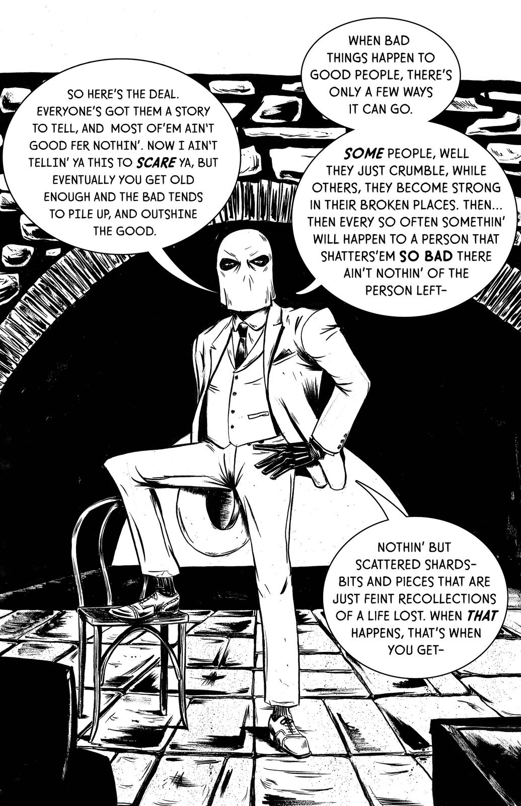 I wanted a few things to come across immediately about Stacker. I want the viewer to look at him and say to themselves “Oh he’s the bad guy,” and I wanted to conceal his identity. I can set the viewer up, knowing that they’ll be making assumptions as we go along, and I’m going to be playing with that.