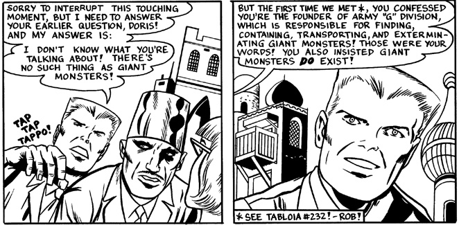 So the Doris Danger Giant Monster stories are about cherishing and loving that aspect of reading comics, of not owning the complete hardcover collection or the full season dvd set, and not knowing the whole story but hopefully not really needing to and just enjoying the ride. The thrill of trying to figure it all out and piece it together and get hold of all the little tidbits to make sense of it all somehow.