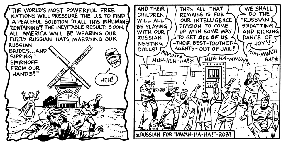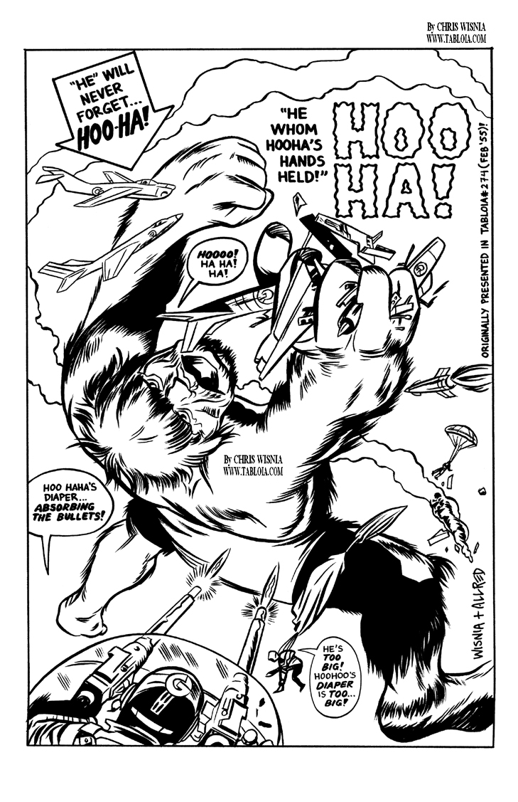 I’ve been working with someone to try and develop a web comic of the series, which would be interactive. As I mentioned, right now the comics are purposely disjointed and non-linear, jumping from chapter to chapter in a difficult-to-comprehend “randomness,” as if you found a stack of comics in a chest in the attic, and issues were out of order and not a complete run. My dream with a web comic is for the reader to be able to click on a character or setting or subject (“robots,” “giant monsters,” “Fez-wearing cult,” “hillbillies”) and link to its first/previous/next appearance, or when the editor notes, “See issue #188,” you could click it and actually see that issue – so that the experiencing of the story-telling becomes almost like a Choose Your Own Adventure. You want to learn more about FBI Agent Felk? You can’t remember what Army Commander Luke Luggash is referencing about race car stickers? Just click on them. For the style of humor I’m using to pay off, you kind of have to pay close attention, and having options like this I think would satisfy a lot of concerns or criticisms people have made of the comic itself.