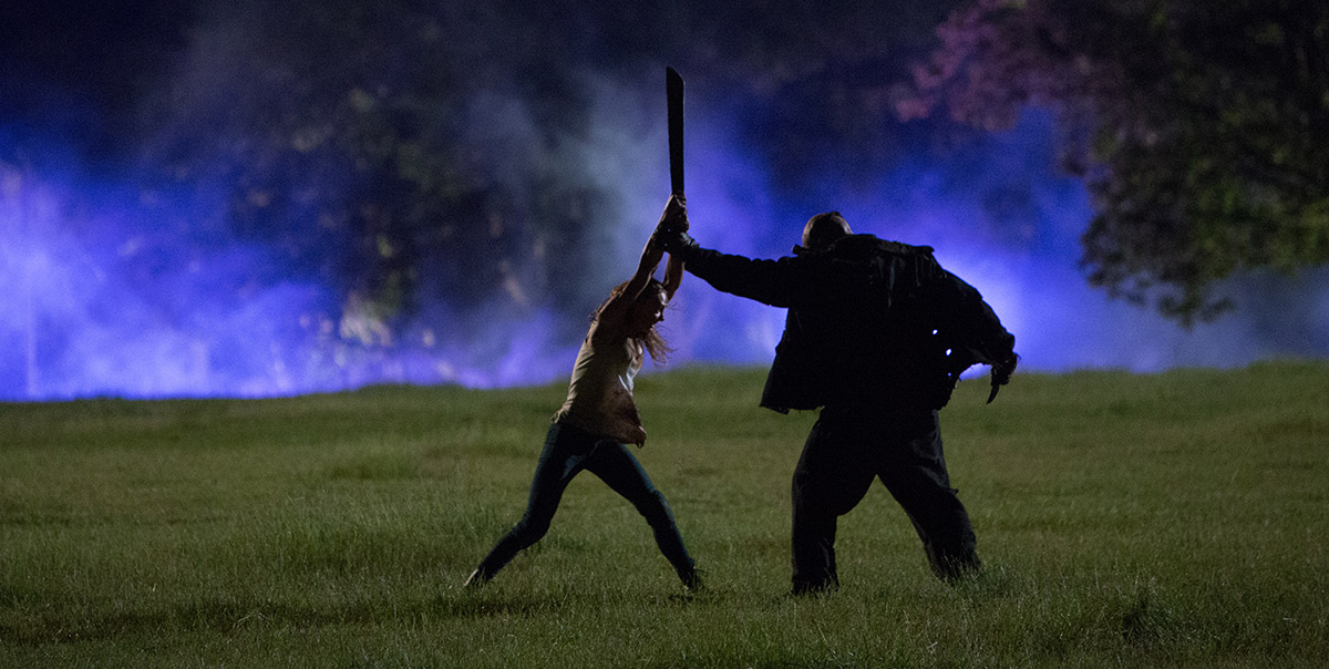 The climactic showdown between Nancy (Malin Akerman’s character in Camp Bloodbath) and the killer is very dramatic, with thunder and lightning. It’s almost like a music video. What was your inspiration for that scene?
