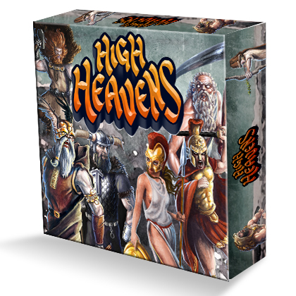 In High Heavens players take the roles of The Norse or Greek gods. The goal is to either destroy the other pantheon’s home-base (Asgard or Mount Olympus) or destroy all of the gods in the opposing pantheon. Players draw cards to invoke gods to the battlefield as well as play Divine Power cards.