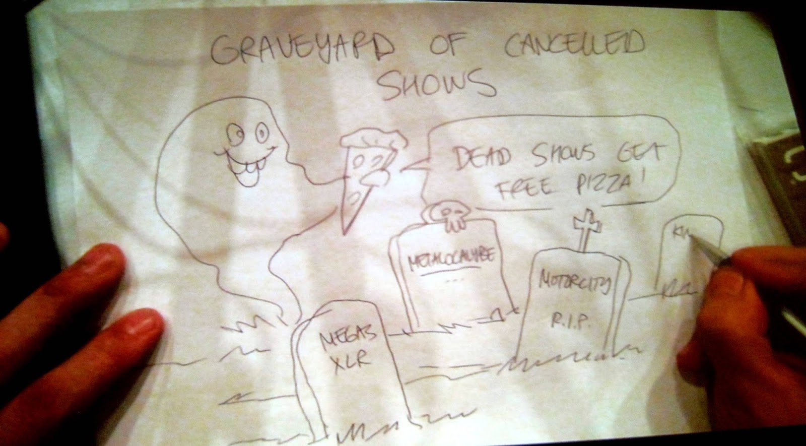 When another audience member gave his praise to their 2004 short-lived animated series Megas XLR, he was verbally and then visually reminded of the plethora of cancelled Titmouse productions as seen in this somewhat depressing but incredibly funny sketch of the Titmouse graveyard, complete with a floating, pizza eating specter.