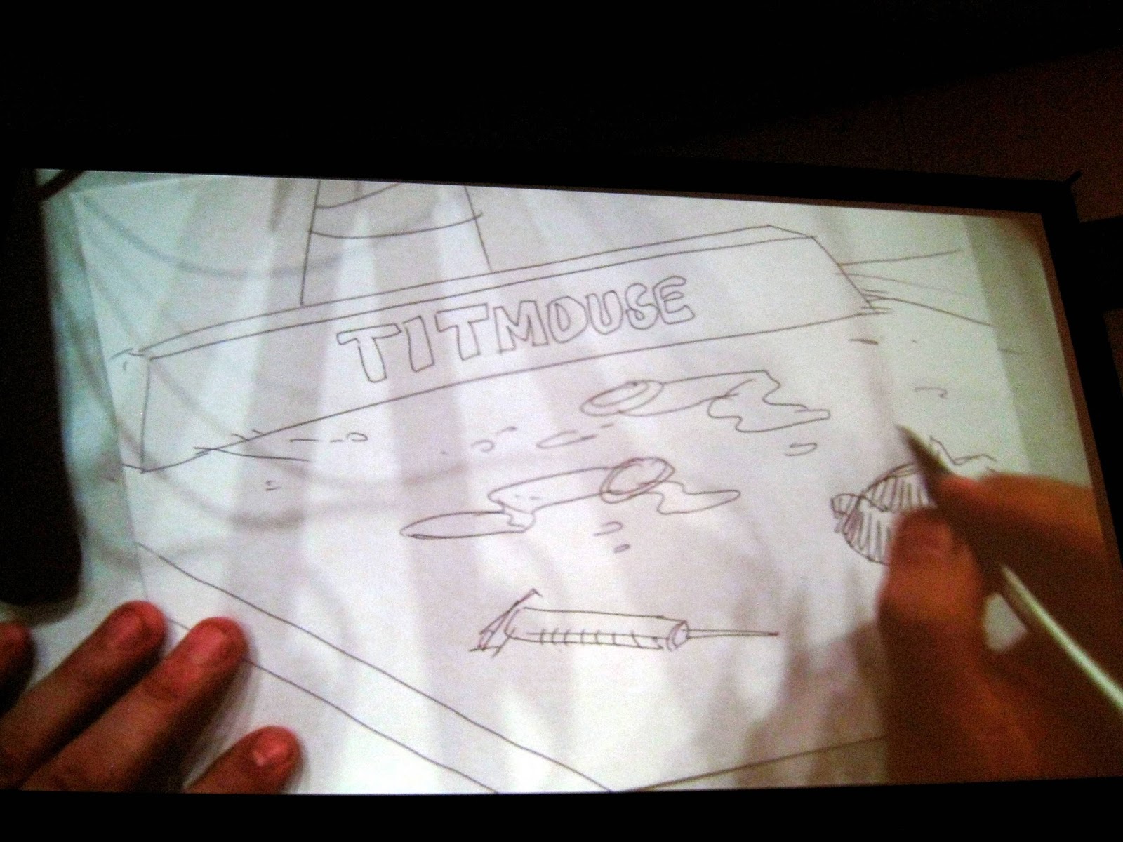 Our pity went out to the young woman who errantly titled Titmouse’s new show as “Moon-BEAN City” when she praised it. The following drawing, which resulted in the first of many hysterical outbursts from the audience, served to visually (and perpetually) remind her of her verbal mistake.