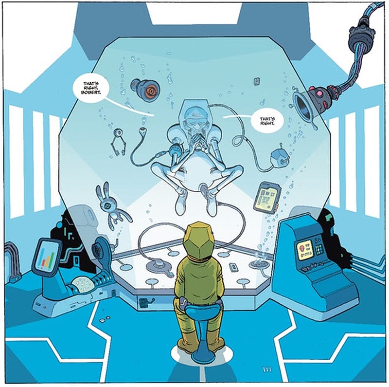 Which brings us full circle to Solid State, the 2017 release from JoCo that is accompanied by a graphic novel — that is to say the whole piece, album and volume is called Solid State. Fraction writes, filling in the gaps between songs with a story about interconnected men, AI and their lives swirling about in the great expanse.