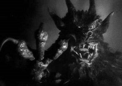 The creature in Night of the Demon is a classical devil in many respects, drawing from the artistic traditions of medieval woodcutters and other works: cloven hooves, the talons of a bird of prey, the stylized wings of a bat and a leonine head with exaggerated teeth, two horns atop its head and elfin ears.
