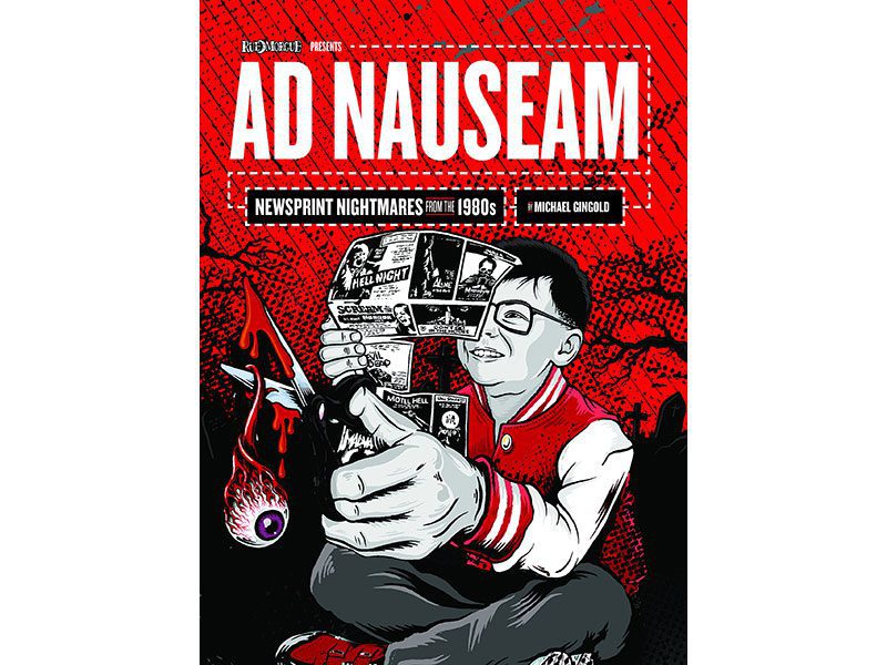 Ad Nauseam: Newsprint Nightmares from the 1980s is a year-by-year deep dive into the Gingold archive, with more than 450 ads! Within these pages you’ll see rare alternate art for Gremlins, Child’s Play, The Blob remake, and the Friday the 13th and A Nightmare on Elm Street franchises. You’ll also revel in oddities including Psycho from Texas, Dracula Blows His Cool, Blood Hook, Zombie Island Massacre, and many more.
