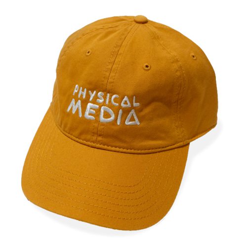 As a matter of fact, this yellow baseball cap touts the passionate focus of movie collectors go for, “PHYSICAL MEDIA”