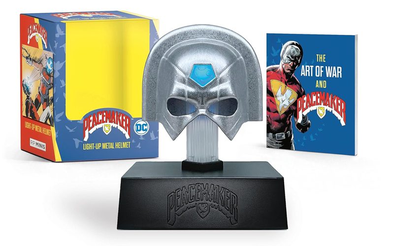 Featuring a 2-inch replica of Peacemaker’s helmet on a display stand. The helmet features a glowing emblem and the set includes a full-color, illustrated 48-page mini book.