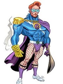 Really, Bruce Timm? Yup, and he even gets Timm to draw him as superhero The Flaming C, shown above.