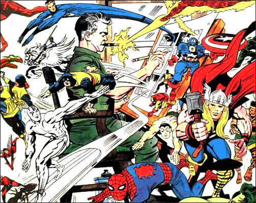 Kirby, who is affectionately known as “The King” is among the most important figures in the history of comic books. Kirby, who passed away in 1994, is either responsible or co-creator of the following icons; The Fantastic Four, The X-Men, Thor, Iron Man, The Avengers, Black Panther, The Hulk, Captain America and Bucky, Ant-Man, Wasp, Nick Fury, The Silver Surfer, Adam Warlock, The Boy Commandos, Captain 3-D, The Challengers of the Unknown, Darkseid, Devil Dinosaur, Doctor Doom, The Eternals, Etrigan the Demon, The Fighting American, Fin Fang Foom, Forever People, Galactus, The Inhumans, Kamandi, Machine Man, Mister Miracle, The New Gods, The Newsboy Legion, OMAC, Quicksilver, The Red Skull, Loki, S.H.I.E.L.D., Sandman, Scarlet Witch, Two-Gun Kid, The Warriors Three, Wonder Man and Ka-Zar.