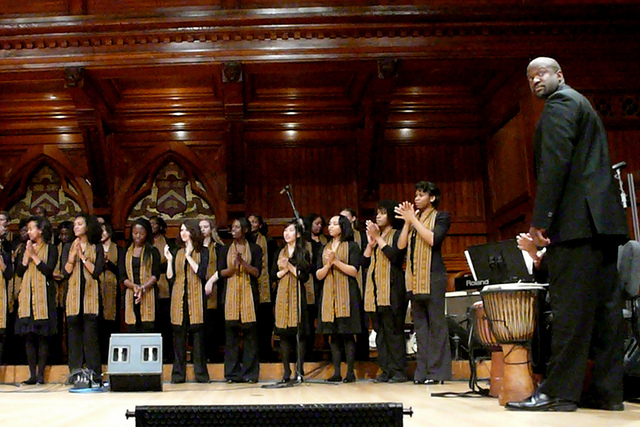 At the end of the concert, Kuumba director Sheldon Reid invites the alumni to join the active choir on stage to sing one last song.