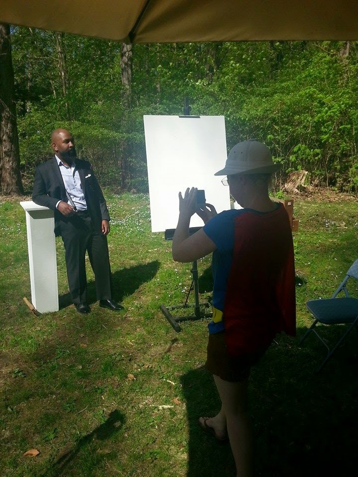 And maybe I can keep this art model thing going as well. On Mother’s Day, I was back in those New Hartford woods, wearing a black suit and posing on a plinth for Anna’s next creation.