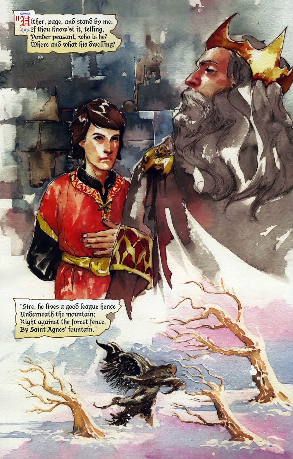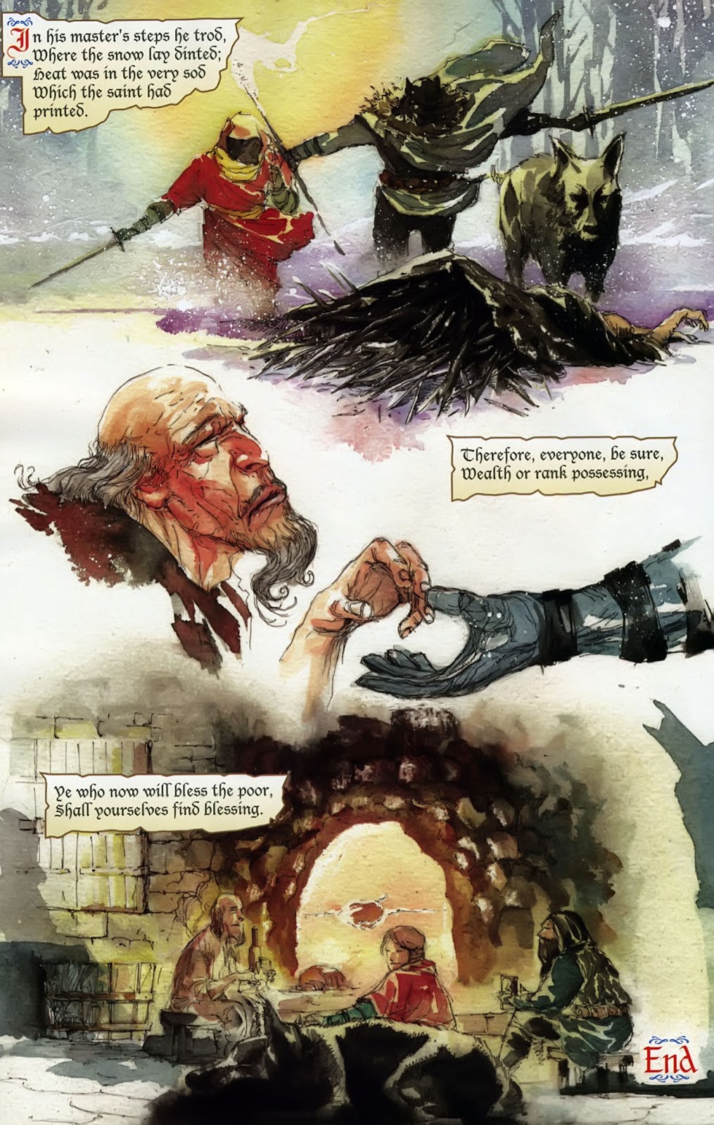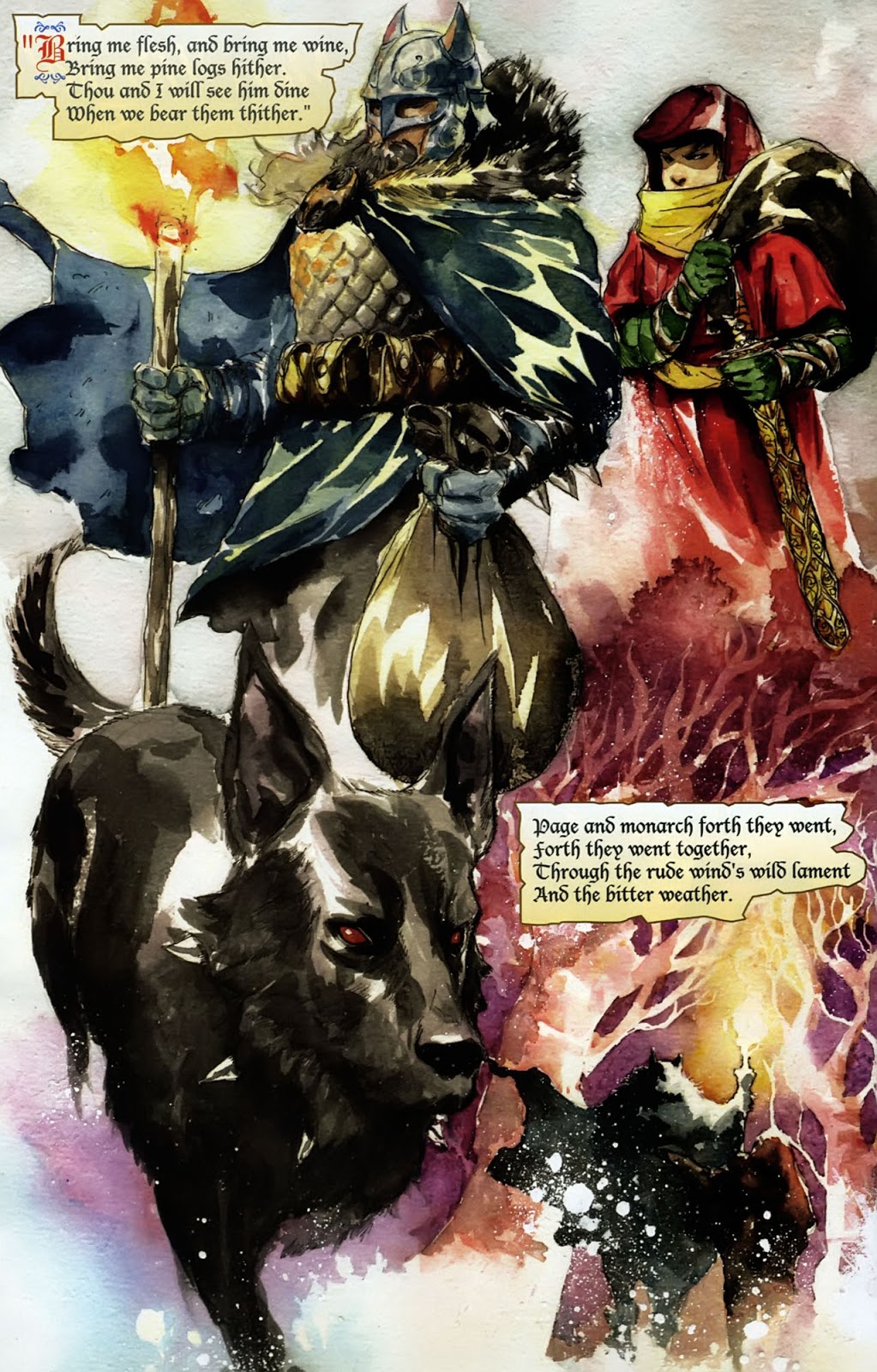 A man of wealth and power spies another of considerably lesser means, inquires if this person, and then sets out in the midst of a howling blizzard to bring food, drink, and warmth. Along the way, he offers his faltering page words of encouragement, and offers to take the brunt of the storm so that his servant can have an easier time.