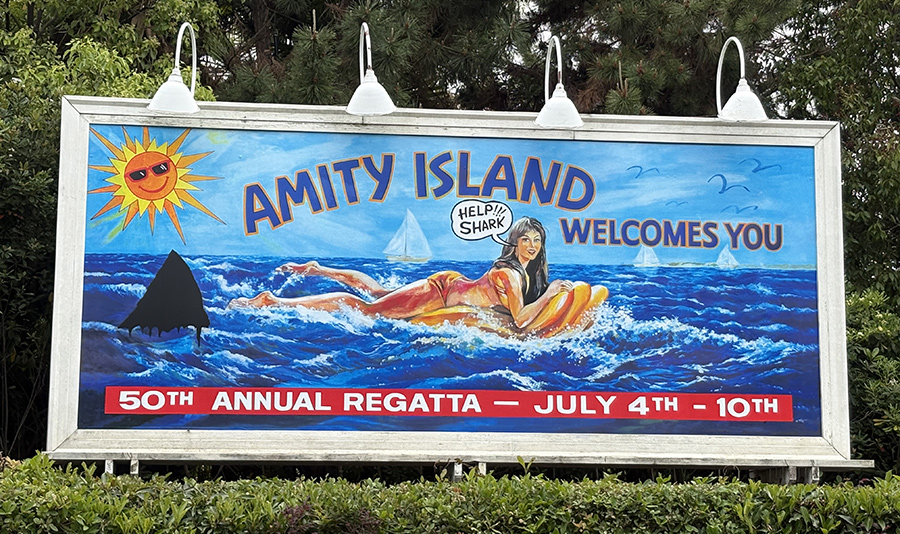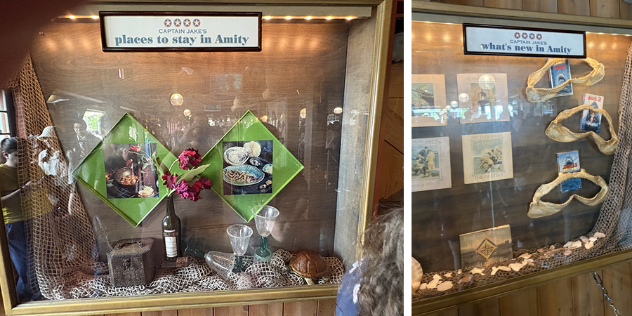 The queue for the ride is fun with shadow boxes of things to do and places to stay in Amity. There’s also, of course, a lot of maritime paraphernalia. Some of it makes it obvious that this ride takes place after the movie.