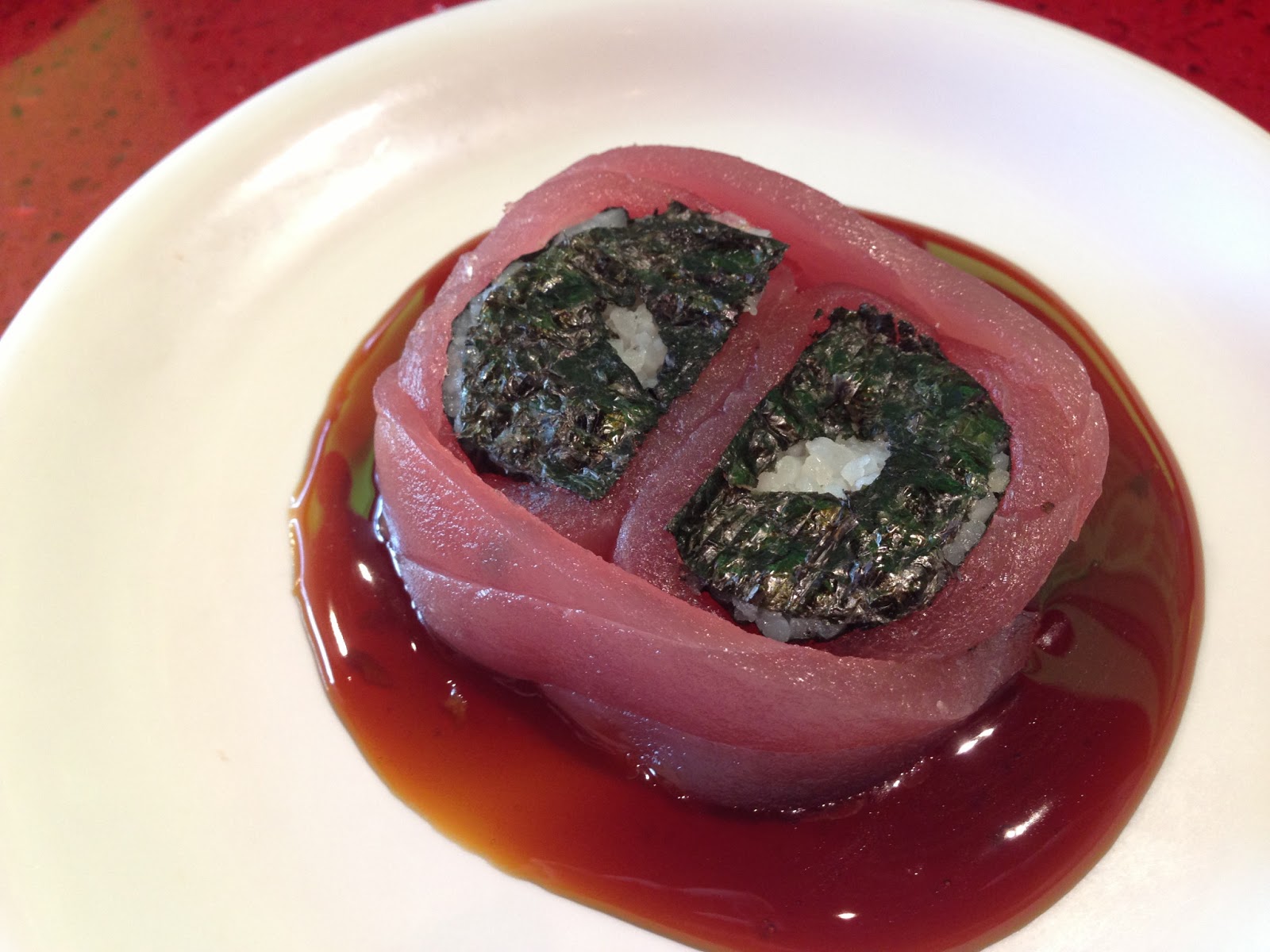 Carefully cut your sashimi grade tuna into strips the same width as your rice. Wrap them around the exterior. Slap one of those suckers down the middle while you’re at it.