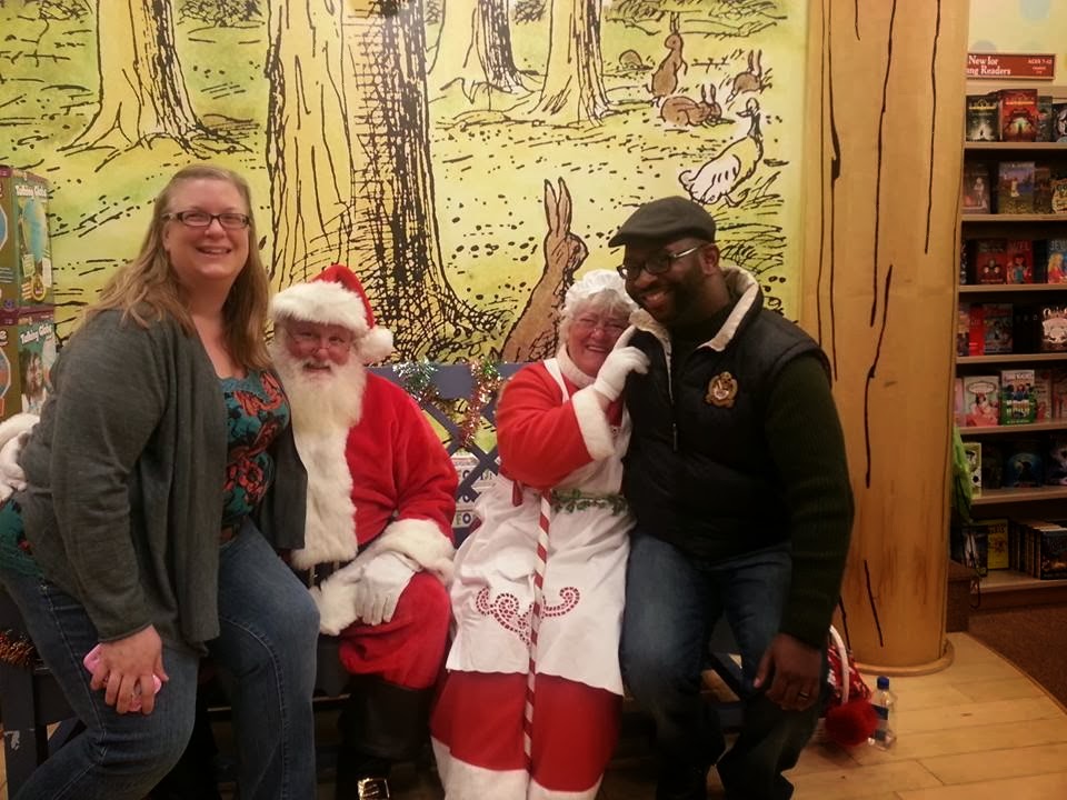 We’re the only adults in the winding line without any children, but no one was looking at us funny. At least, I don’t think so. Or maybe they thought our kid was running around the aisles until it was our turn. Who knows? All I do know is that Mrs. Claus got fresh with me after she jokingly wagged a finger at my wife for sitting on Santa’s lap.