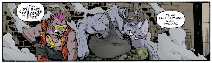 The thing is, this ain’t the warthog and rhino that you used to know. These are not the bumbling buffoons from the original animated series. In this street level incarnation that resembles the original comic series, Bebop and Rocksteady are ruthless killers with super strength and nearly unstoppable.