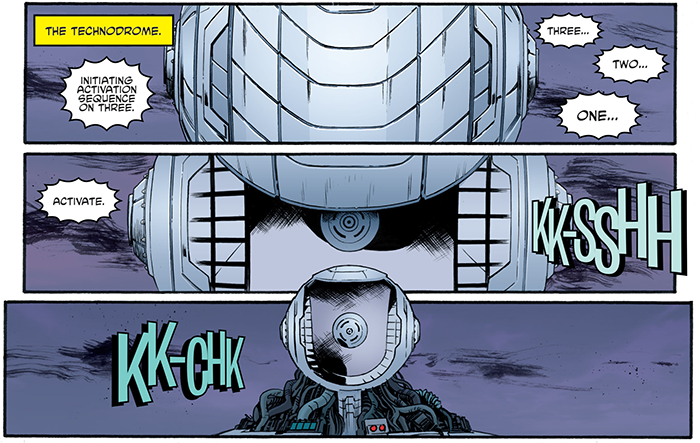 Smith’s work shines in the final moments when Krang’s army and The Foot Clan finally come face to face on Burnow Island where the Technodrome is stationed. The illustrations did so much with just thirteen panels and three pages. Right before Krang stated his order to attack, there is a close up his eyes that are just filled with arrogance as he believes Shredder is no match for him.