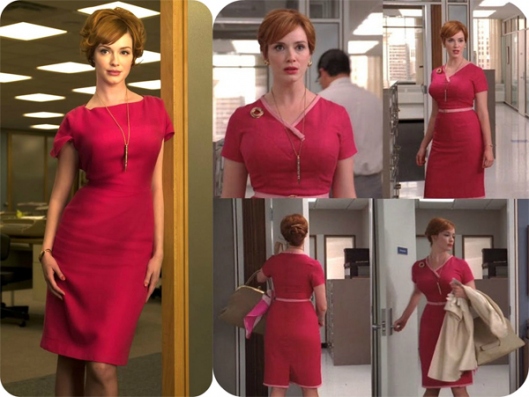 Joan looks stunning in a pink, true to the period outfit. Her hair pulled back with a bump for a professional, fashionable look.